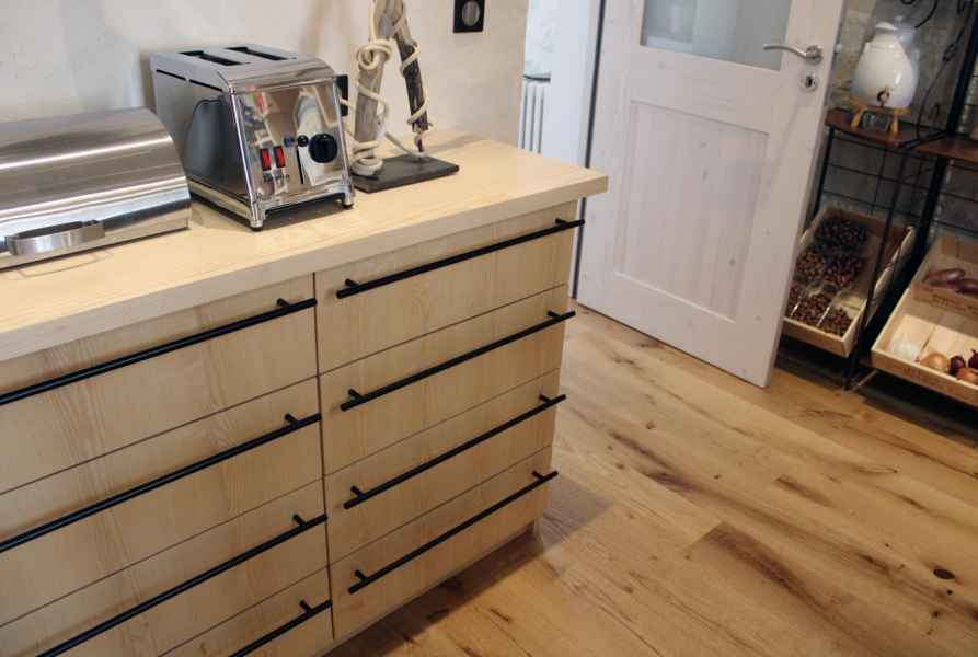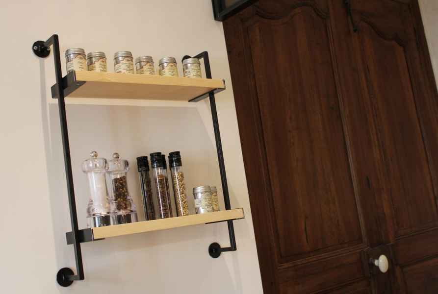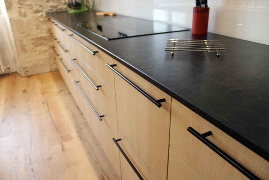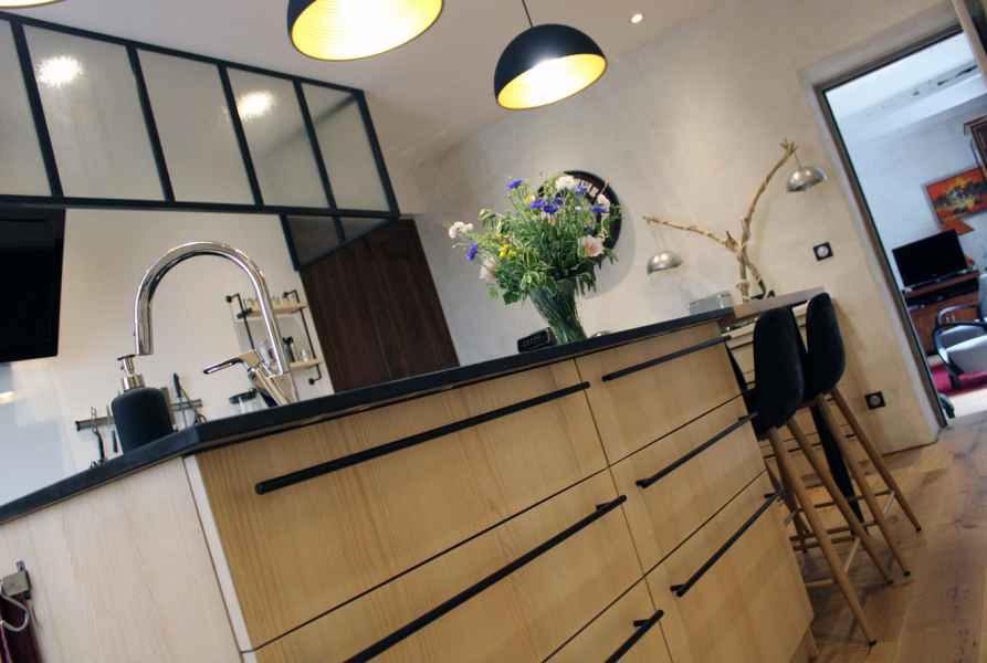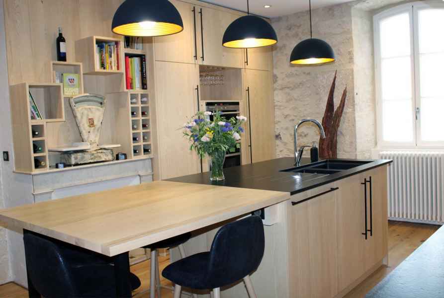 Conception de l'ensemble des éléments : plan de travail, chariot, casier, desserte, placard, rangement, bar, mange-debout, range bouteilles, tiroirs sur mesure...
